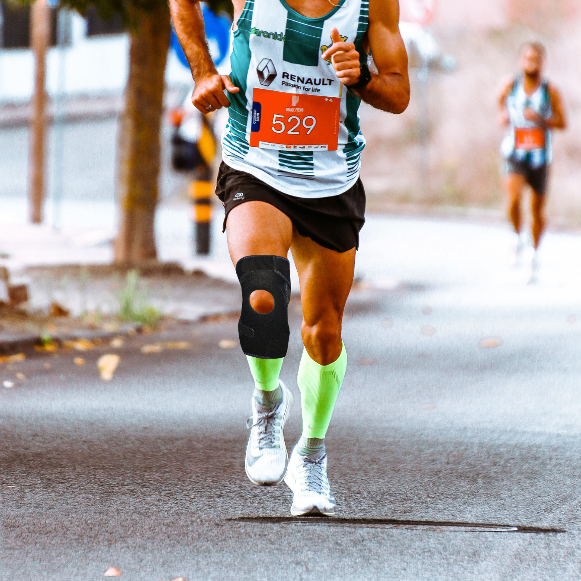 Grâce à la combinaison de baleines flexibles de chaque côté, de sangles ajustables et d'une conception ouverte au niveau de la rotule, le genou bénéficie d'un maintien optimal sans pression sur celle-ci. La forme anatomique assure un ajustement parfait à la jambe et au genou, gage de confort et d'efficacité. La compression est forte et offre un bon maintien, tout en restant suffisamment confortable pour un port prolongé au travail, dans les activités quotidiennes ou sportives.